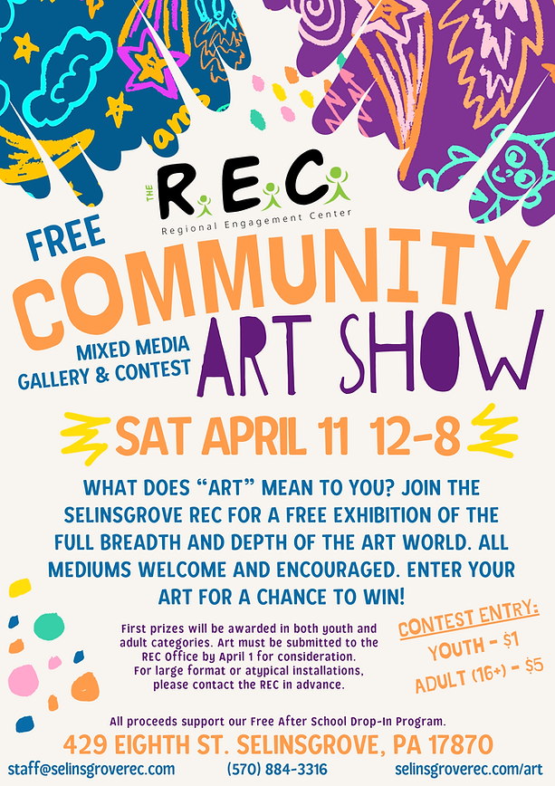 What does ART mean to you? Join the Selinsgrove REC for a free exhibition of the full breadth and depth of the art world. All mediums welcome and encouraged. Enter your art for a chance to win!